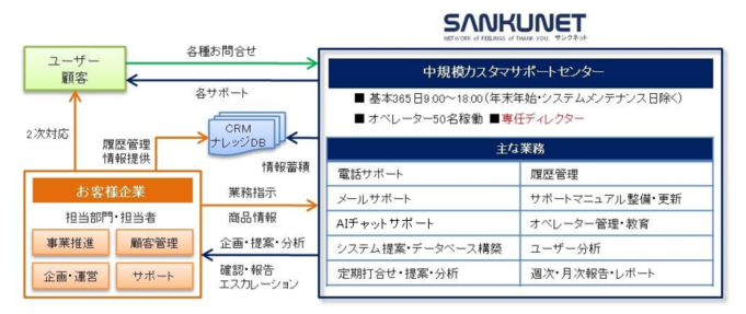 サンクネットでは、従来は電話対応のみで運用されていたカスタマーサポートセンターを、電話・メール・AIチャットボットのすべてに対応可能なマルチコンタクト型センターとして再構築した。